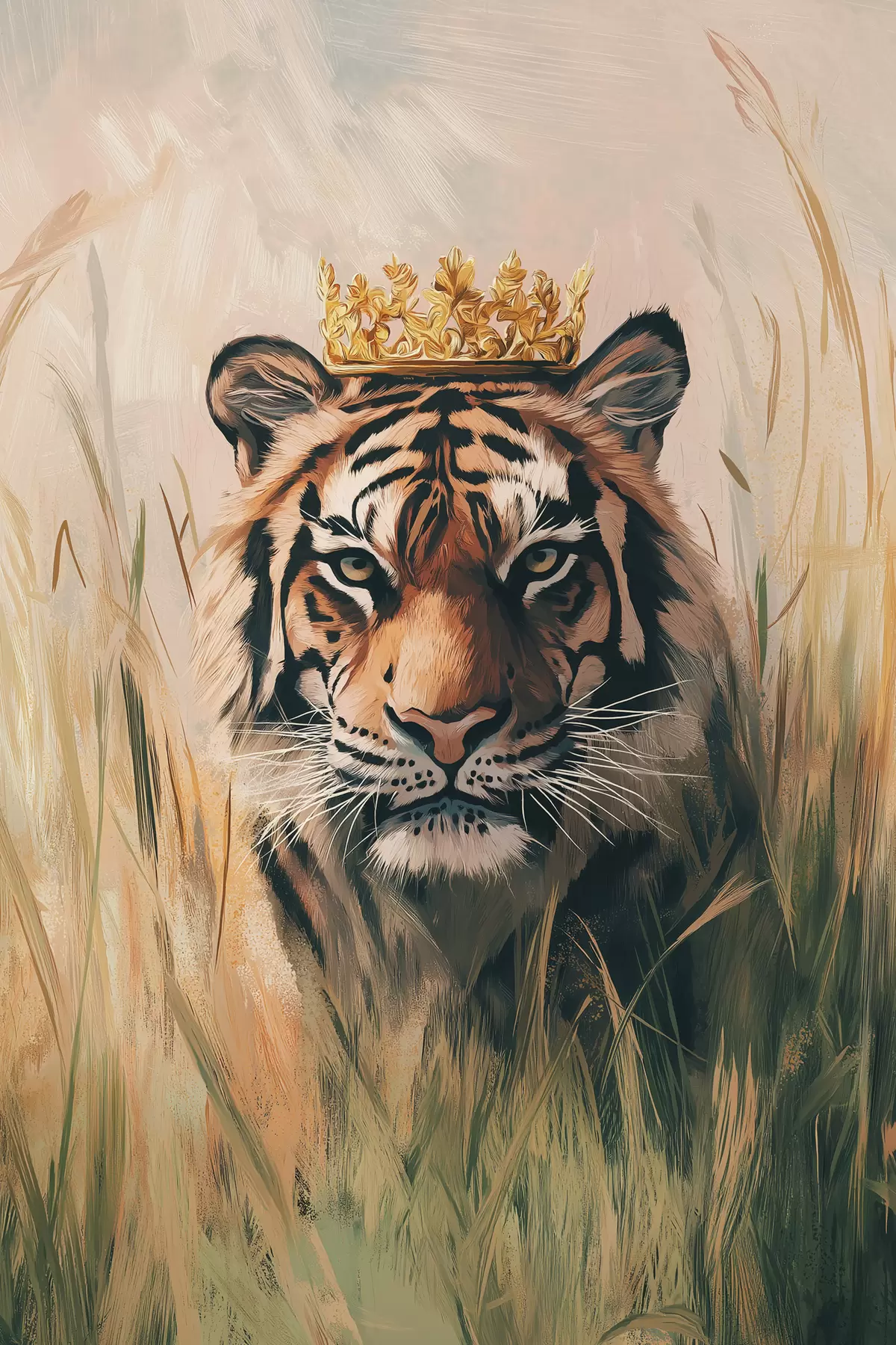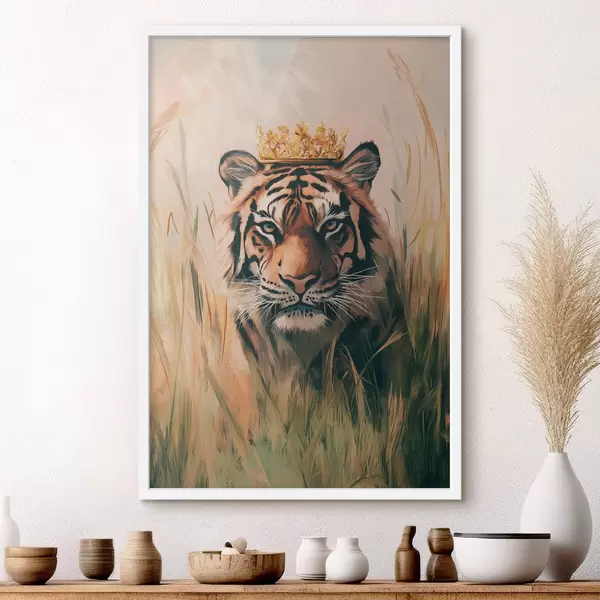 Poster Tigre su un prato con erba, corona, disegno acrilico Nr f42783