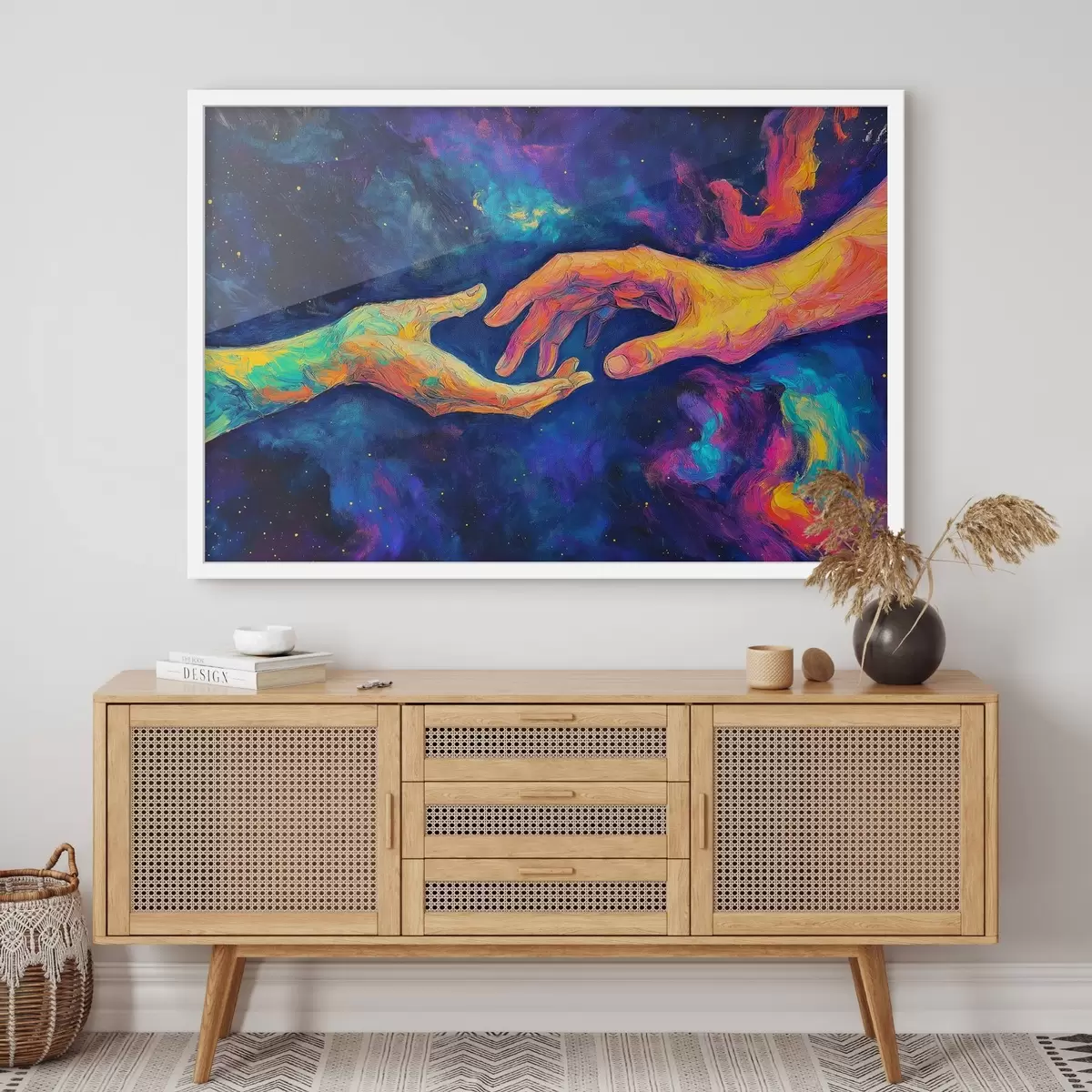 Poster Composizione astratta di due mani che si tendono l'un l'altra, in una tavolozza di colori vivaci su uno sfondo cosmico f42937