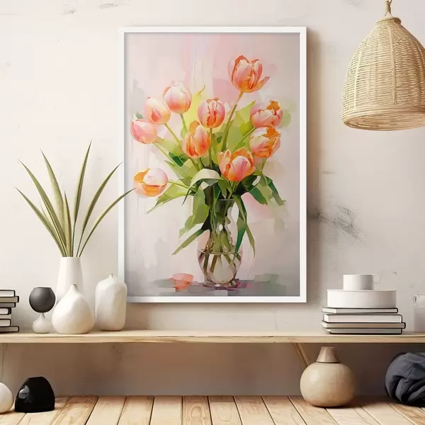 Poster Natura morta pittorica con tulipani in un vaso di vetro su sfondo chiaro f42940