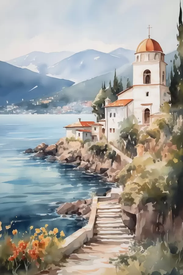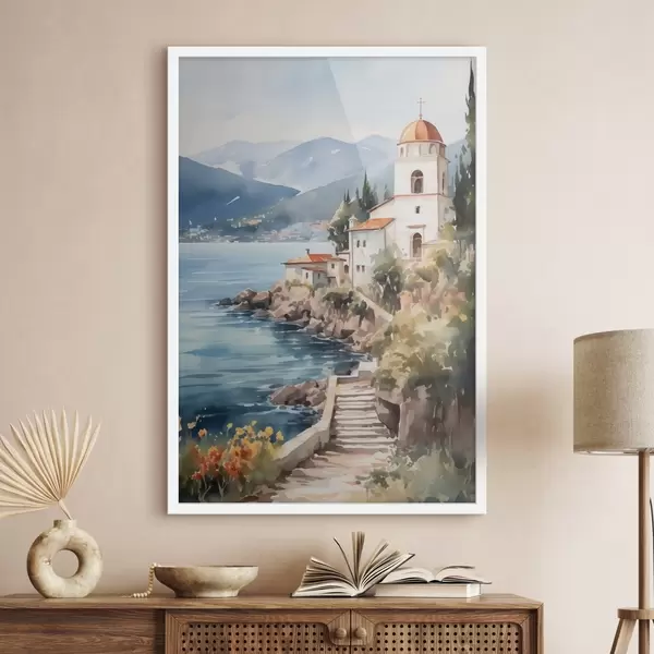 Poster Chiesa in riva al mare con montagne sullo sfondo Nr f42962