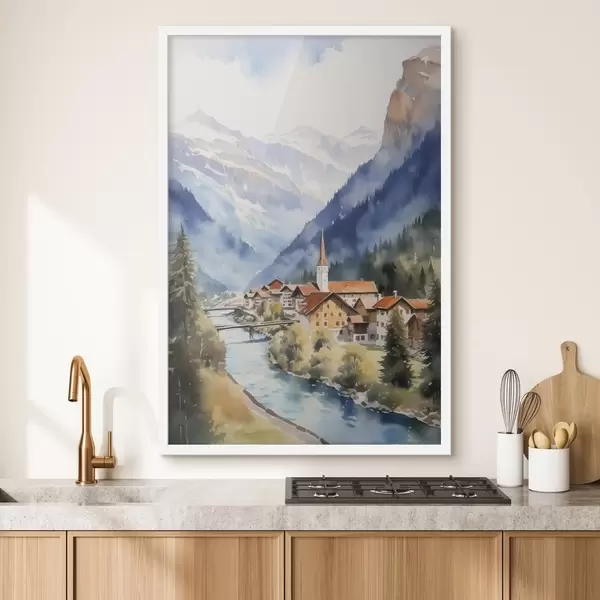 Poster Villaggio vicino alle montagne imitazione acquerello Nr f42964