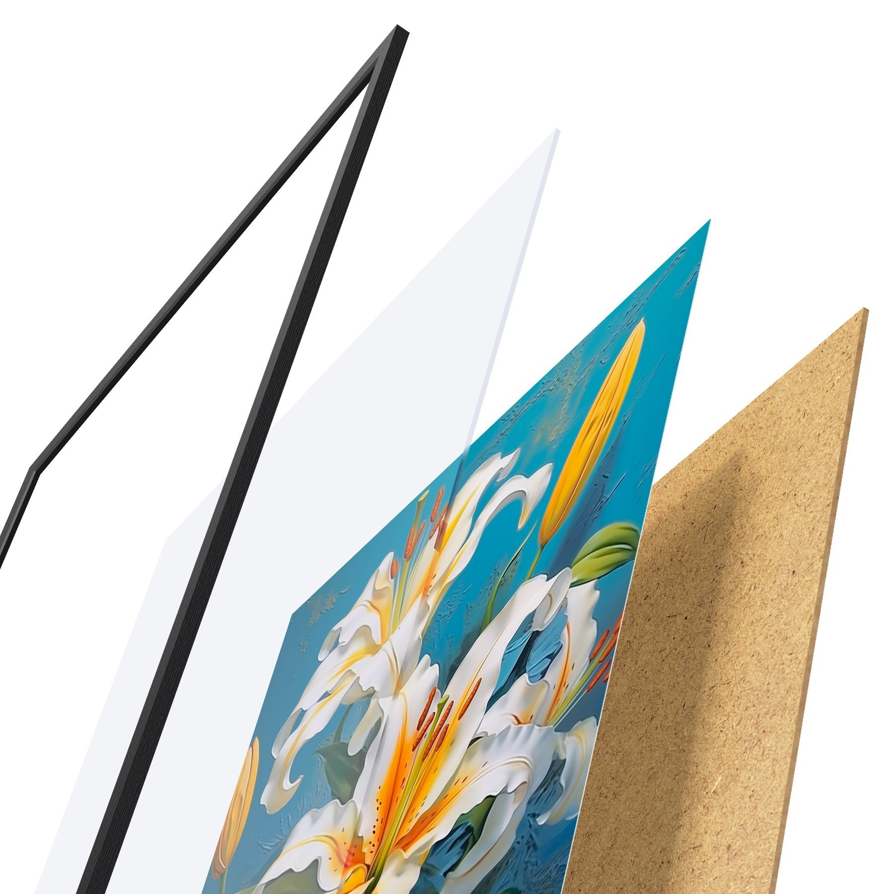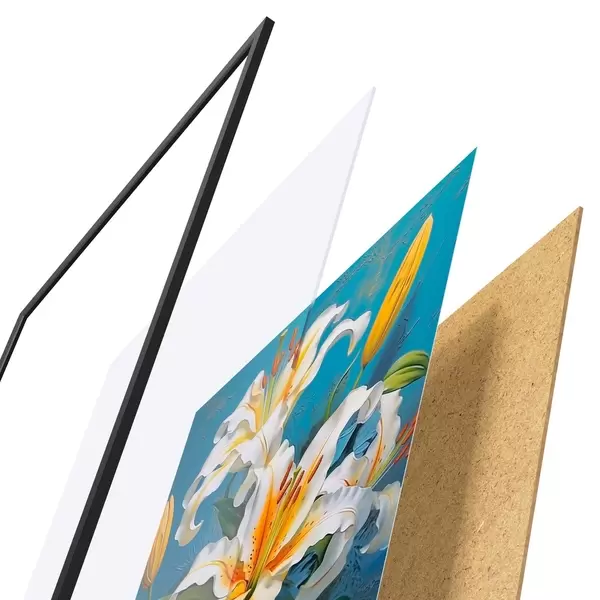Il poster è composto da cornice, plexiglass, immagine stampata e supporto in truciolato. Il poster può essere immediatamente appeso alla parete grazie ai supporti sul retro.