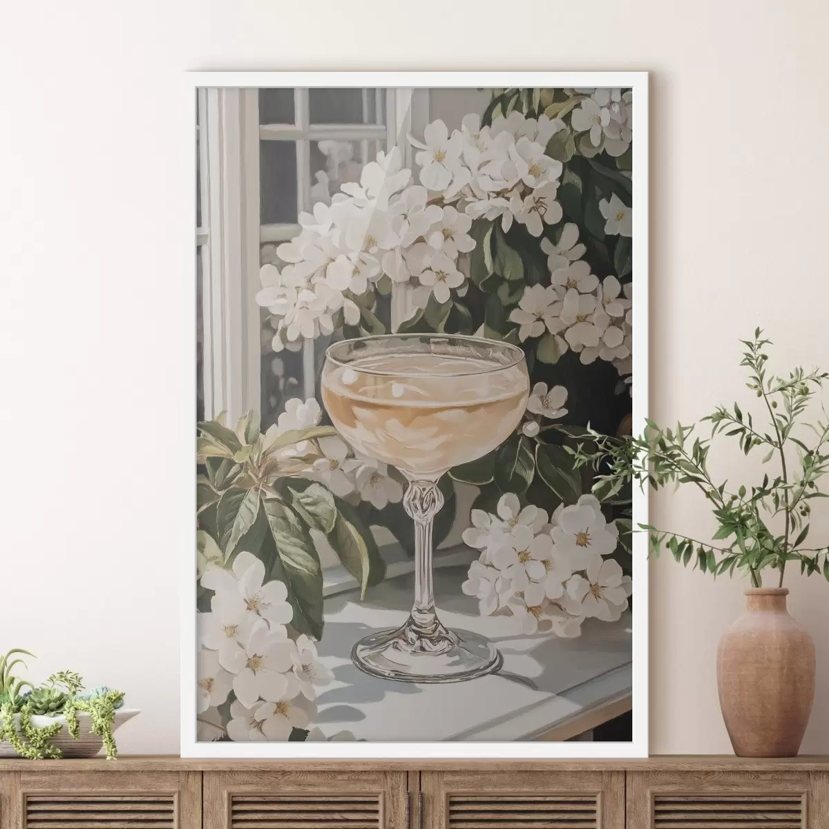Poster Bicchiere di champagne, vintage, stile acquerello, fiori bianchi f43051