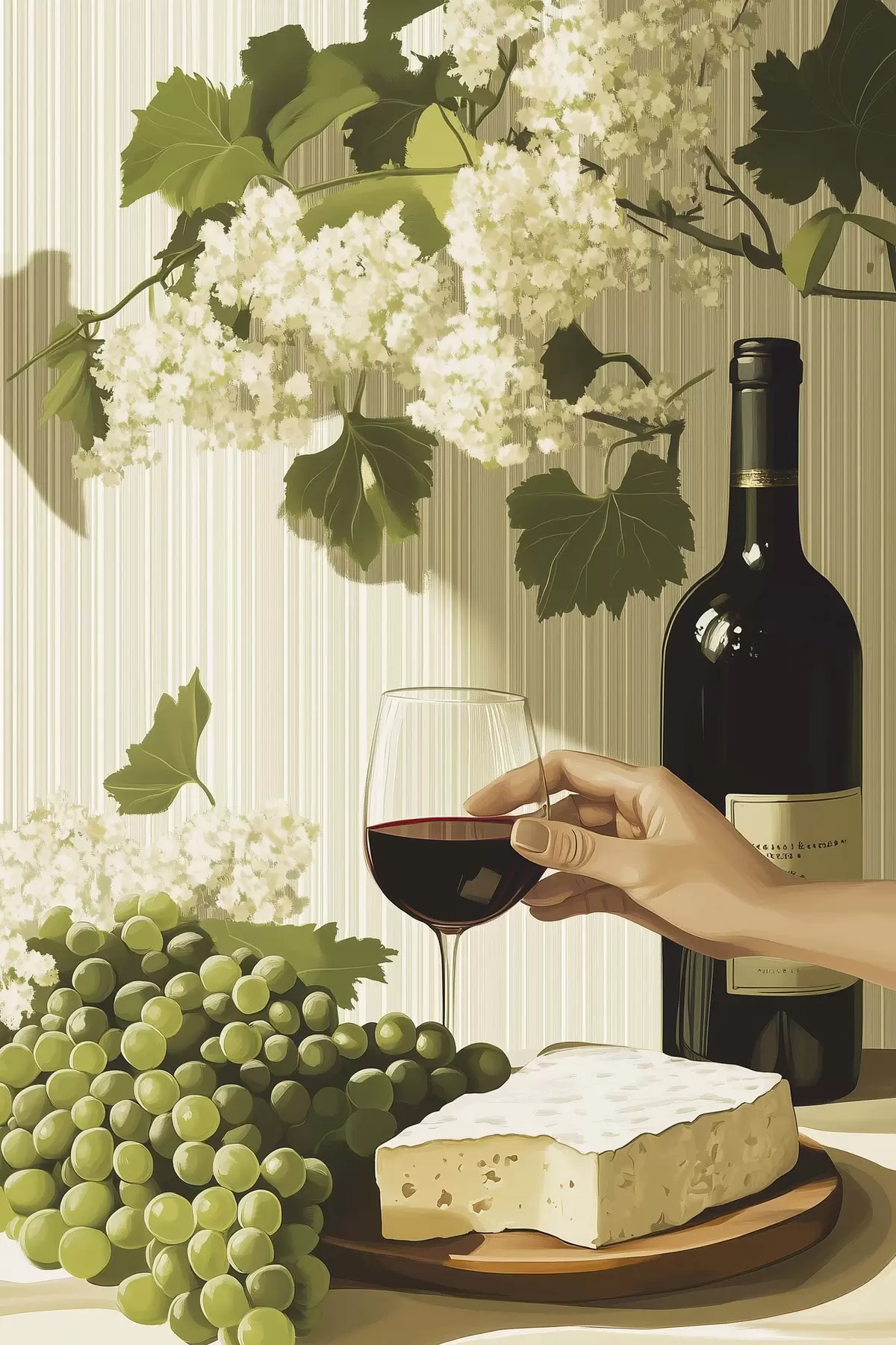 Poster Uva con formaggio, bottiglia di vino, stile vintage, fiori bianchi f43052