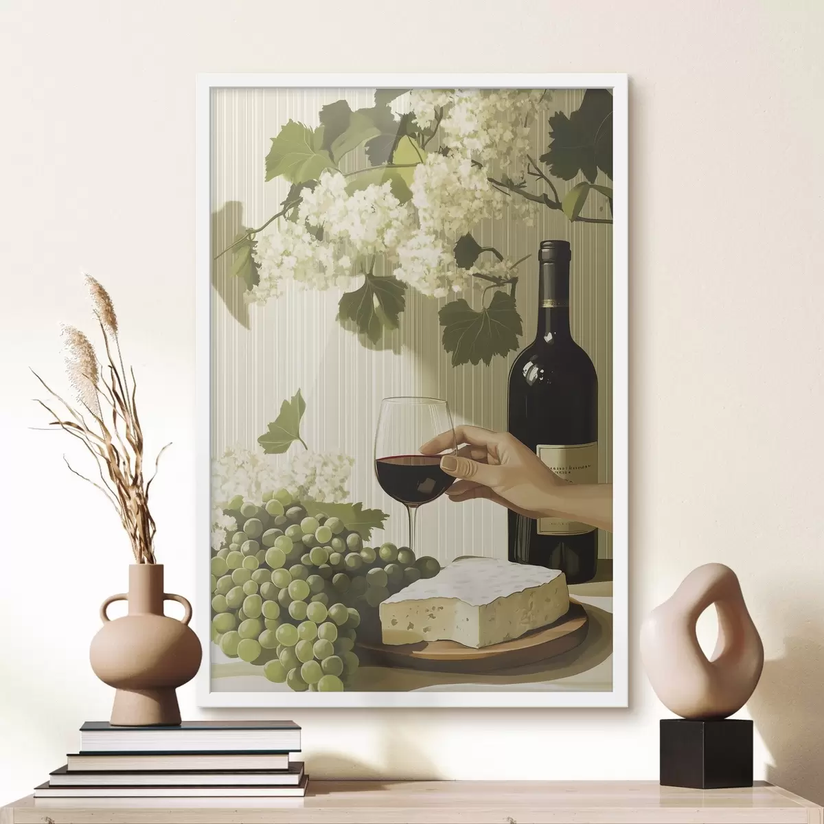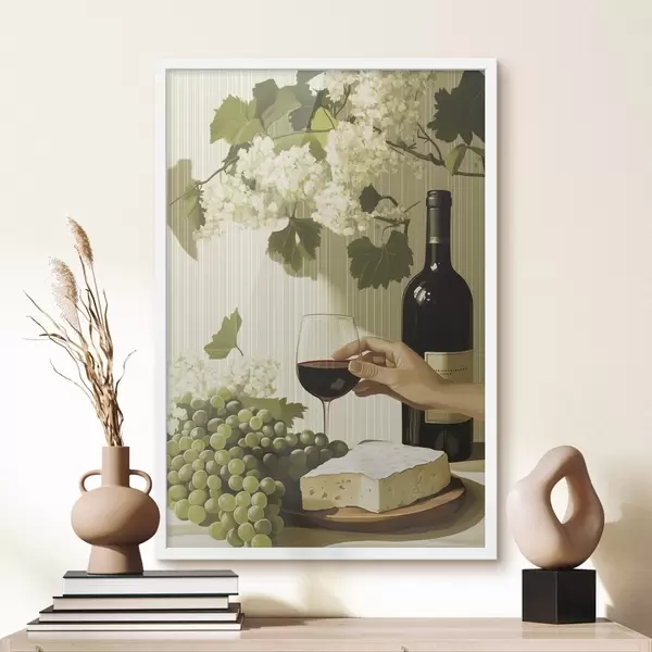 Poster Uva con formaggio, bottiglia di vino, stile vintage, fiori bianchi Nr f43052