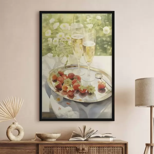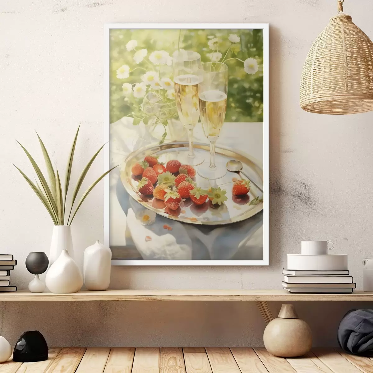 Poster Bicchieri da champagne con fragole sul vassoio, fiori di camomilla, estate Nr f43054