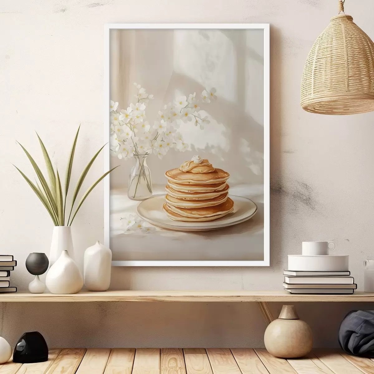 Poster Deliziosi pancake con burro di arachidi, stile acquerello, vaso con fiori bianchi Nr f43063