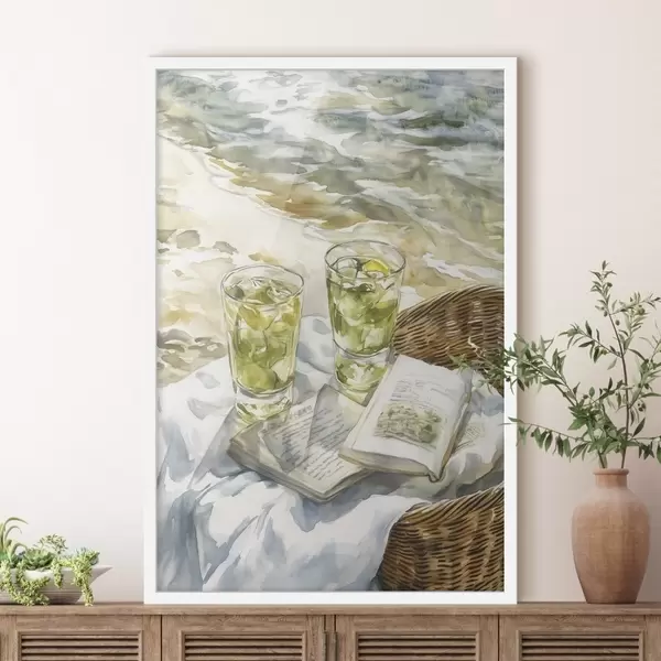 Poster Picnic vicino al mare, cocktail estivi, poesia, stile acquerello Nr f43068