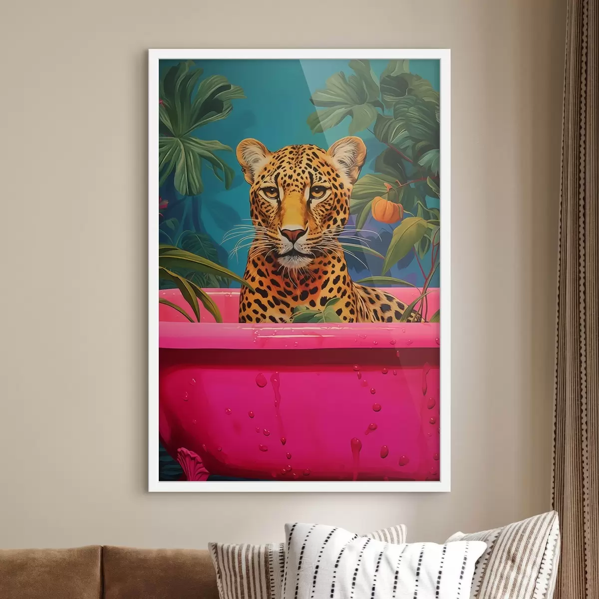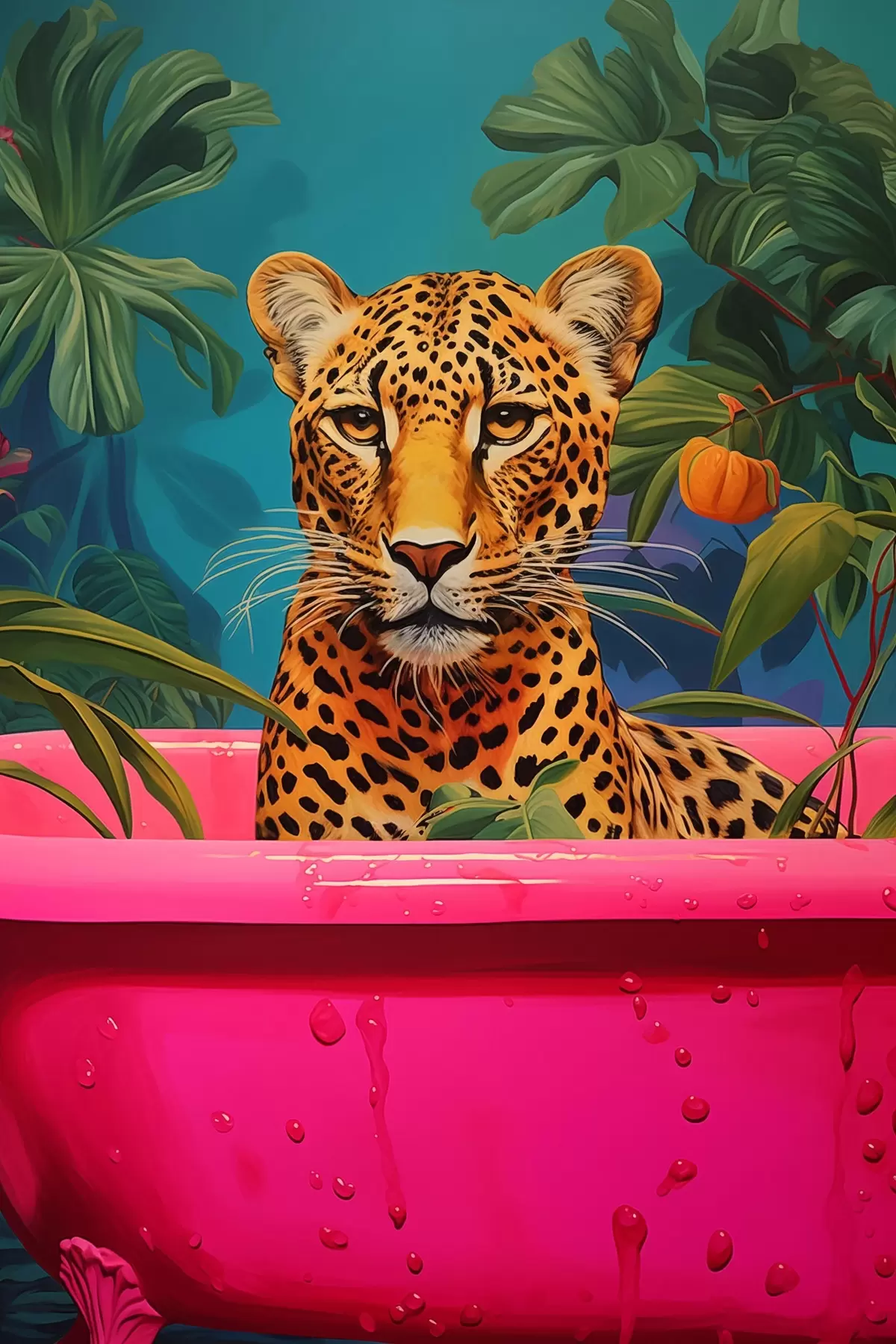 Poster Un leopardo in una vasca da bagno rosa tra piante esotiche Nr f43135