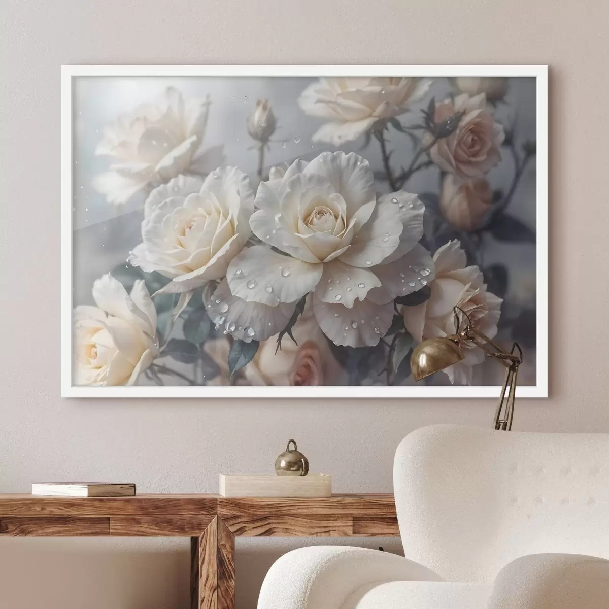 Poster Un gruppo di rose bianche con gocce d'acqua sui petali, alcune foglie verdi, sfondo tenue, luce soffusa Nr f43163