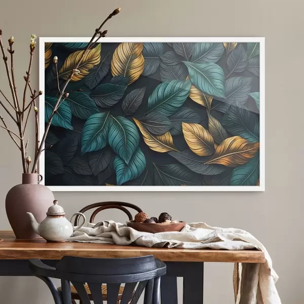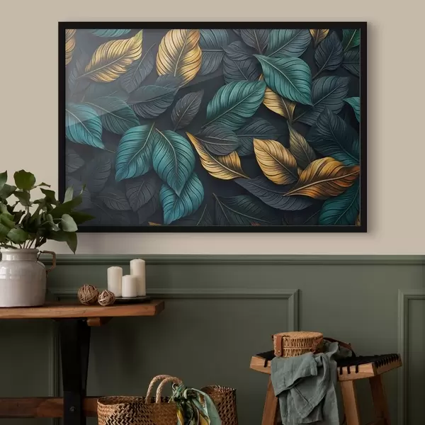 Poster Foglie verde scuro, gialle e nere con venature scure, su sfondo scuro, elegante atmosfera tropicale Nr f43164