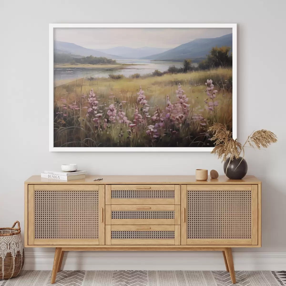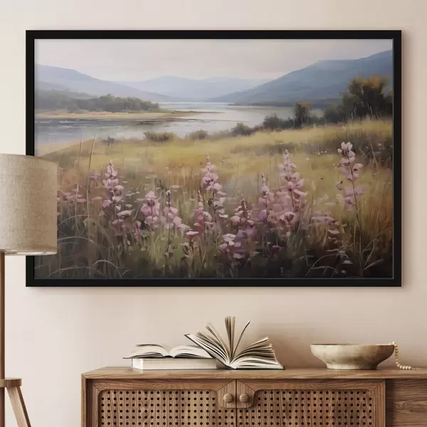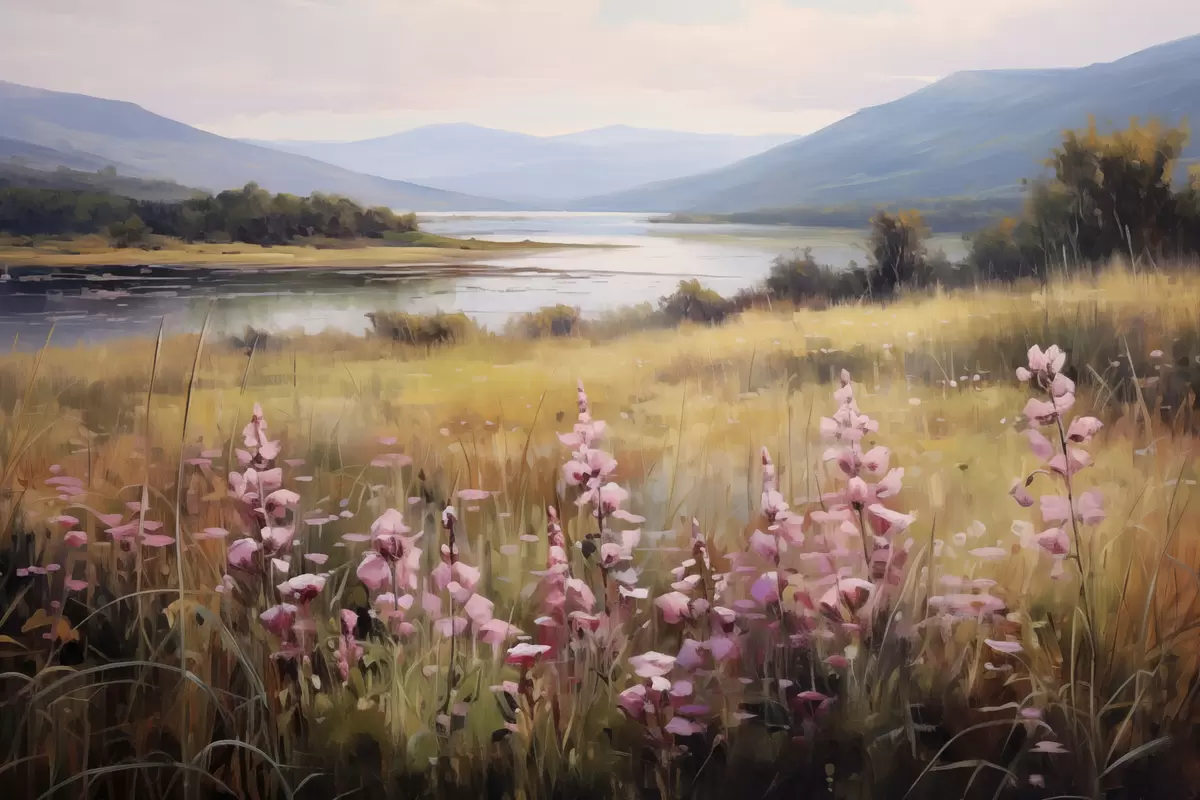 Poster Un paesaggio con un campo di fiori rosa, un lago e montagne sullo sfondo, sotto un cielo nuvoloso Nr f43165