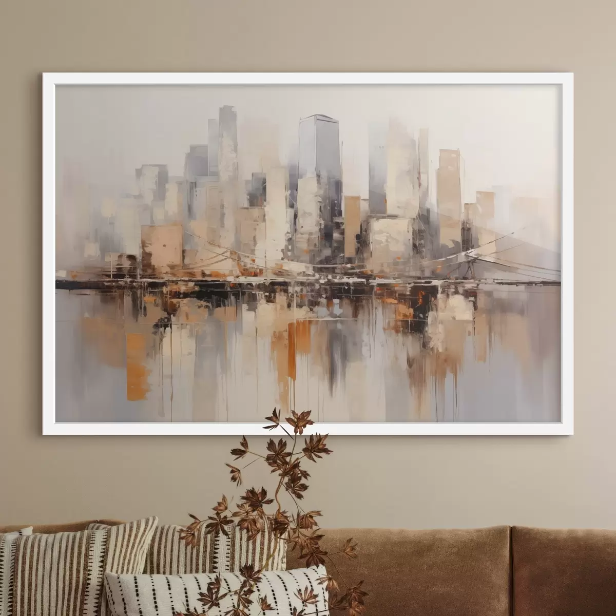Poster Quadro astratto di paesaggio urbano con alti edifici nei toni del marrone, del grigio e del bianco, riflessi nell'acqua sottostante Nr f43168
