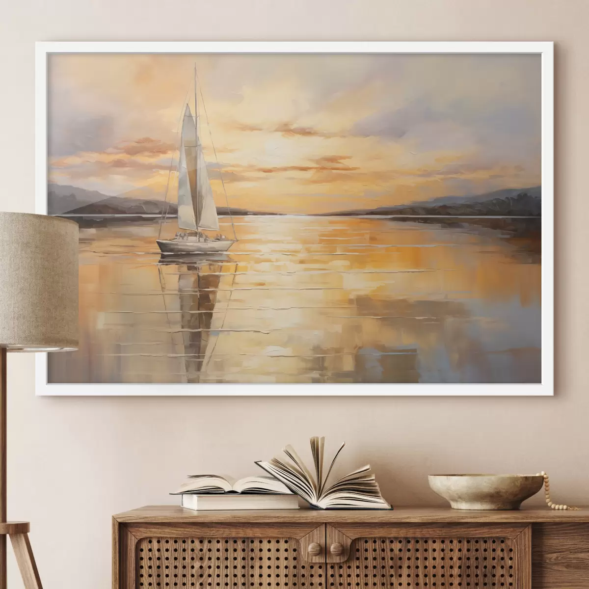 Poster Paesaggio dipinto con una barca a vela su un mare calmo, cielo arancione e giallo, montagne lontane Nr f43169