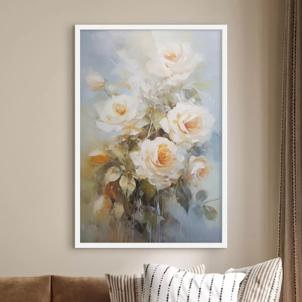 Poster Rose bianche e arancioni, su uno sfondo azzurro tenue, con pennellate visibili e stile pittorico Nr f43175