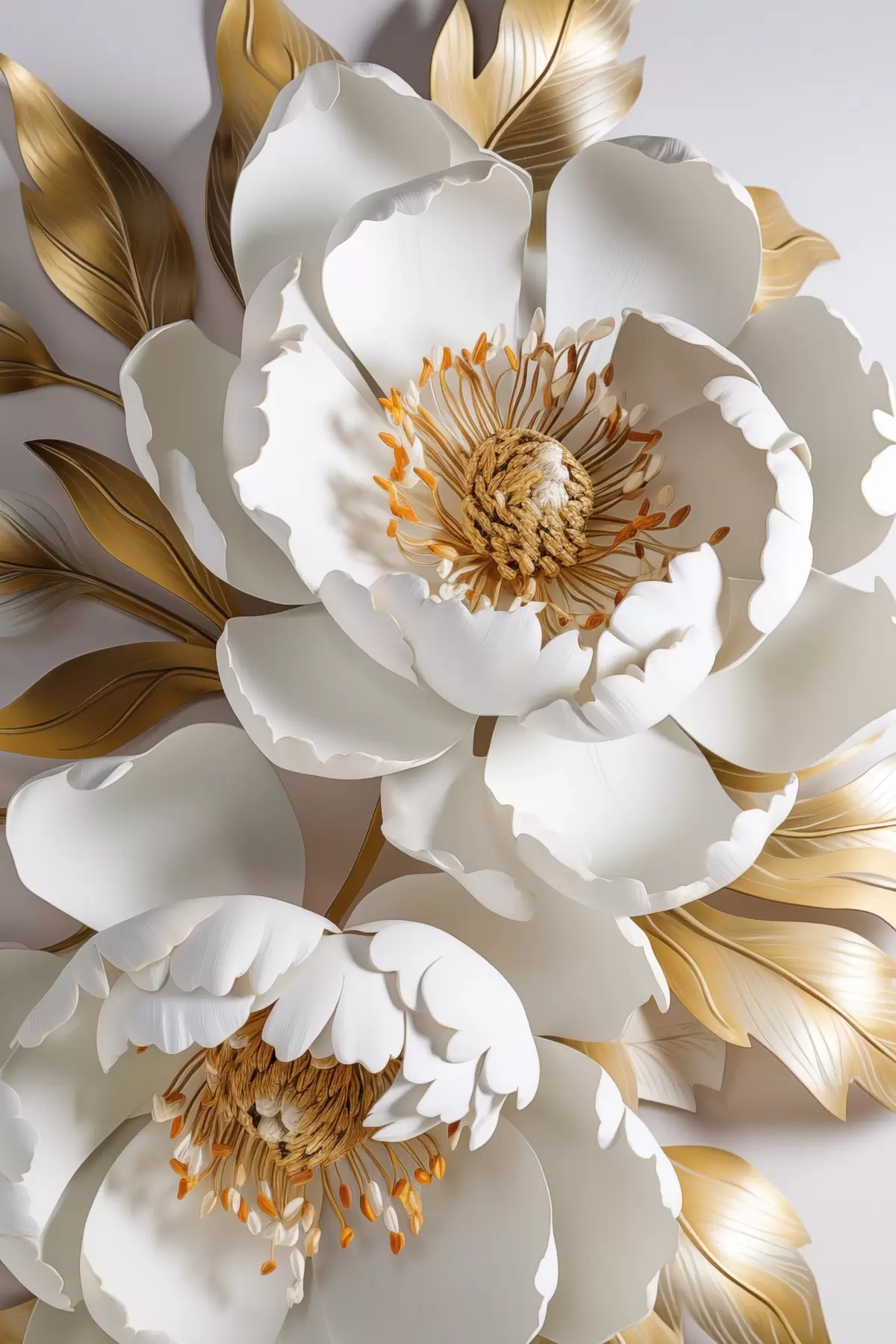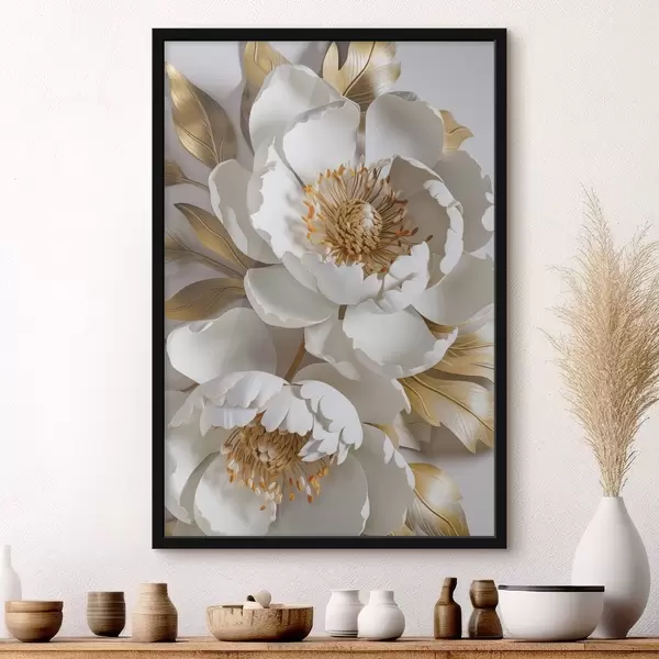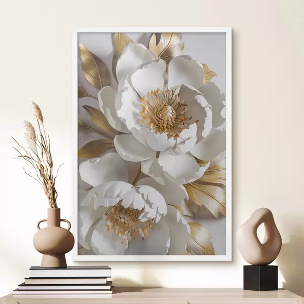 Poster Fiori di peonia bianchi, delicati e dettagliati, con foglie gialle, lo sfondo è di colore grigio chiaro Nr f43176
