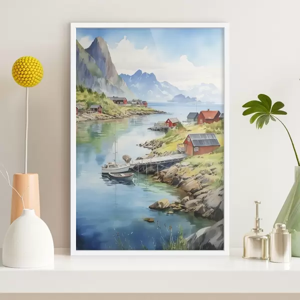 Poster Paesaggio estivo delle isole Lofoten, case rosse, montagne, imbarcazioni Nr f43187
