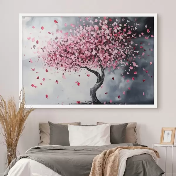 Poster Albero fiorito rosa su sfondo grigio f43299