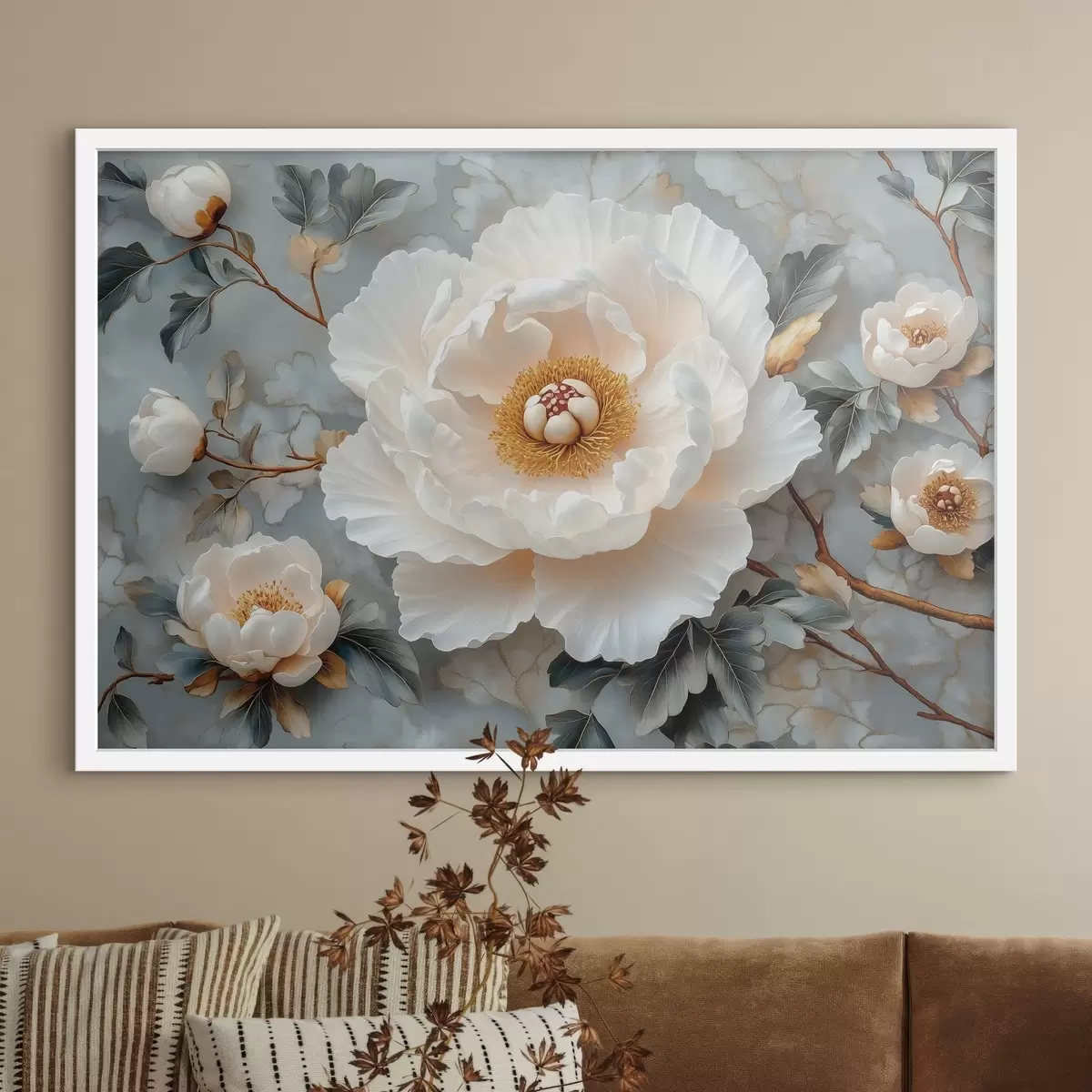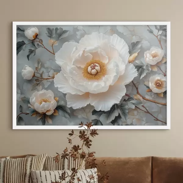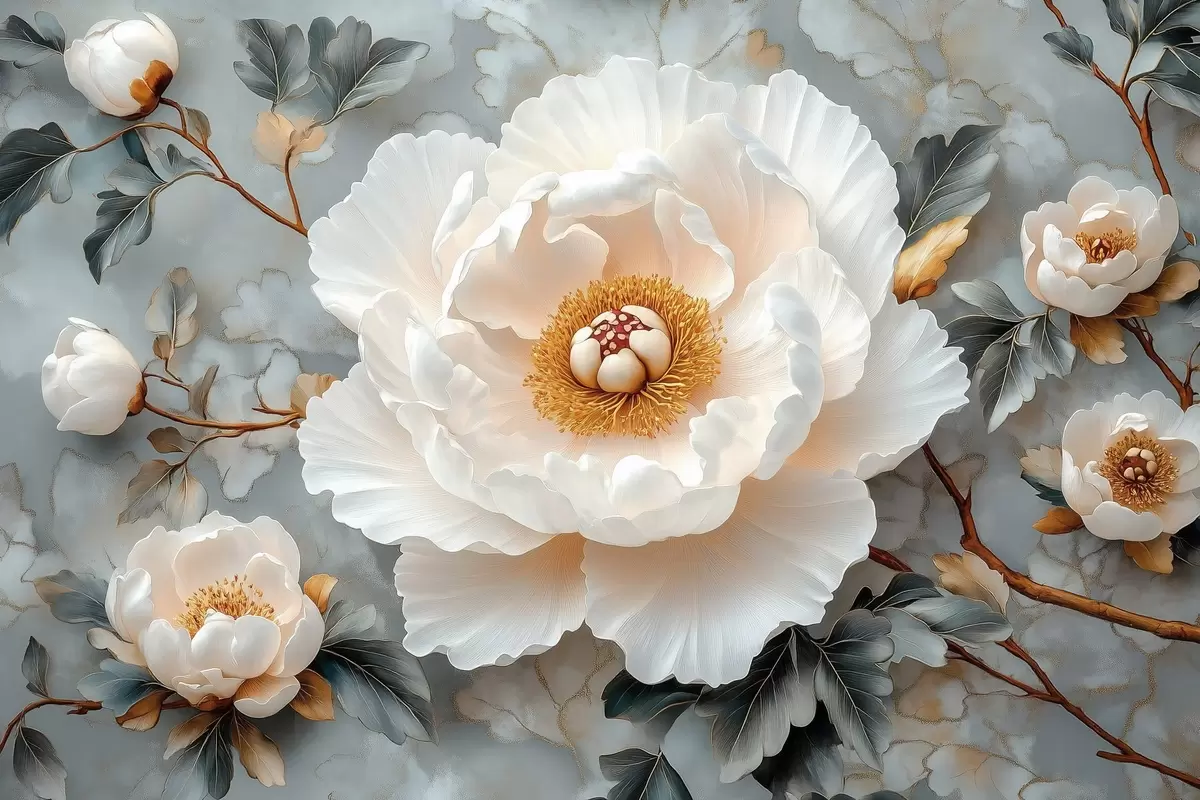 Poster Una splendida peonia su uno sfondo di foglie e piccole peonie Nr f43315
