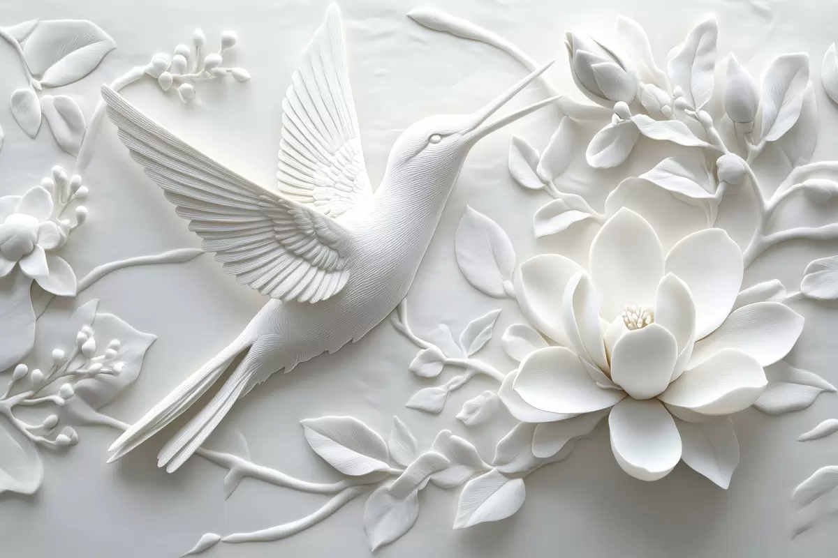 Poster Immagine 3d in bianco e nero di un uccello e dei fiori circostanti f43329