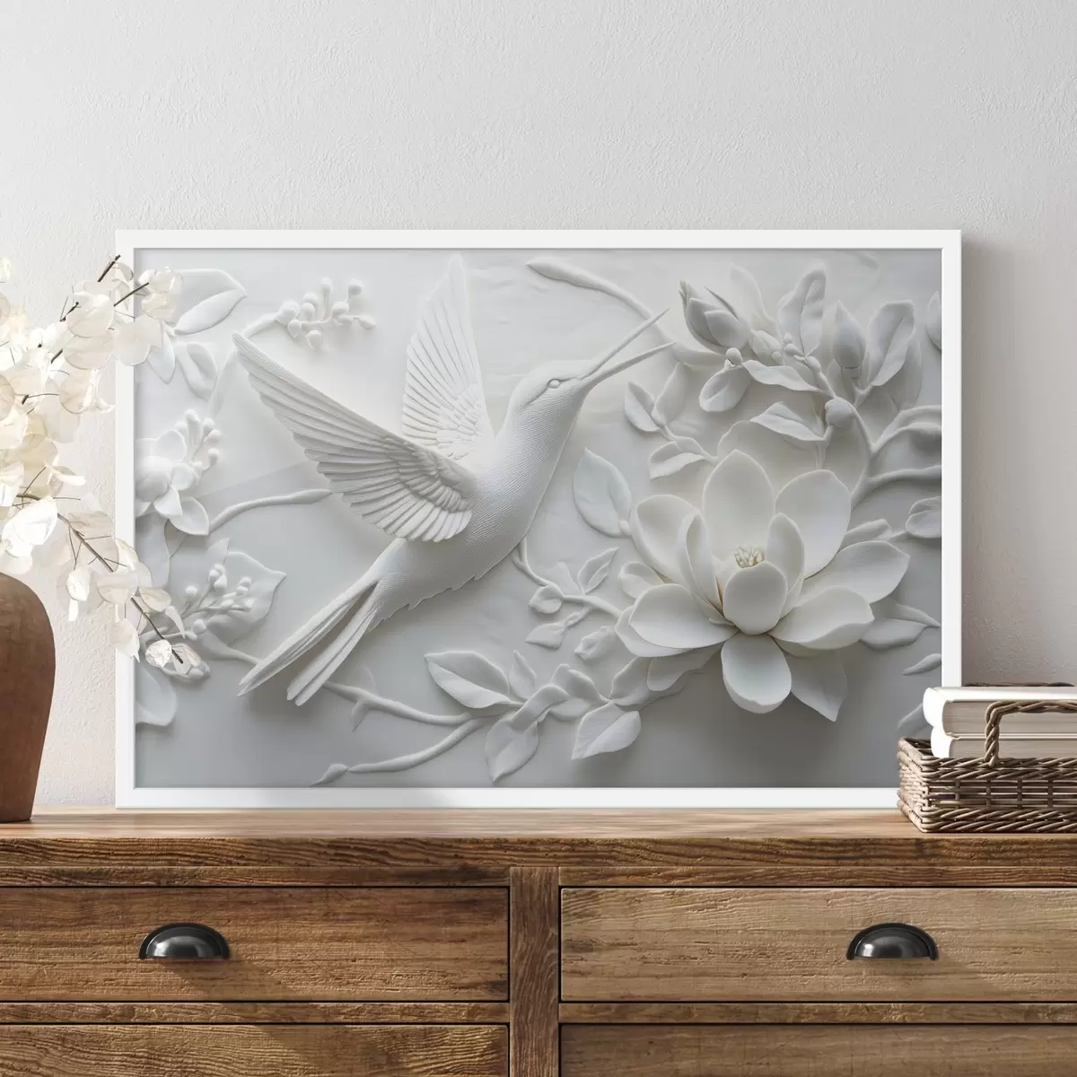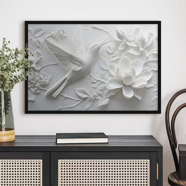 Poster Immagine 3d in bianco e nero di un uccello e dei fiori circostanti Nr f43329