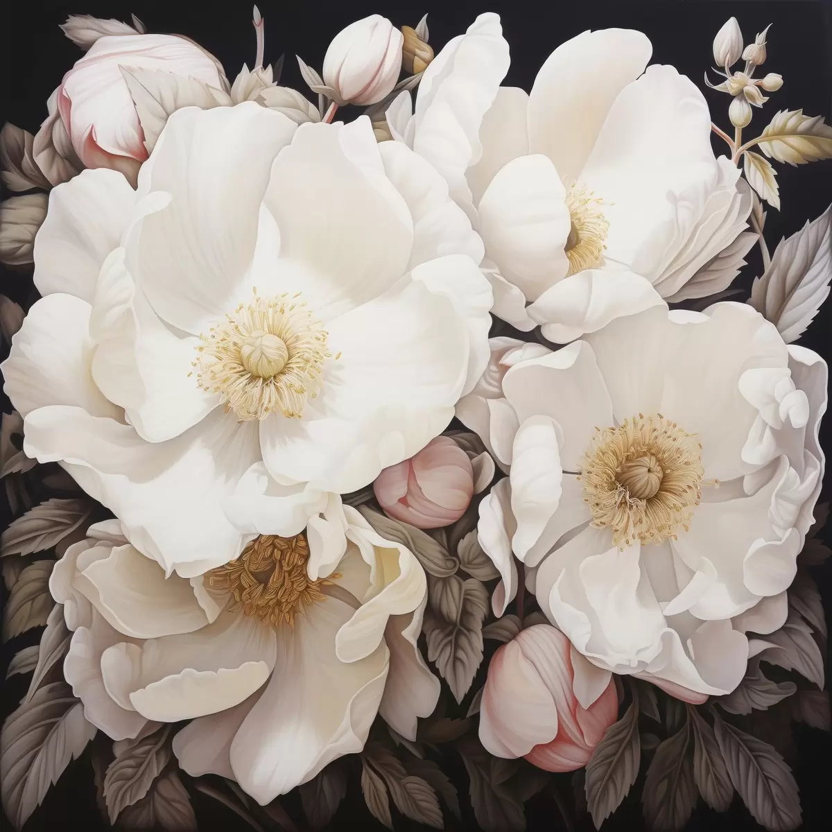 Poster Fiori di peonia bianchi su sfondo scuro in stile pittura acrilica Nr f43379
