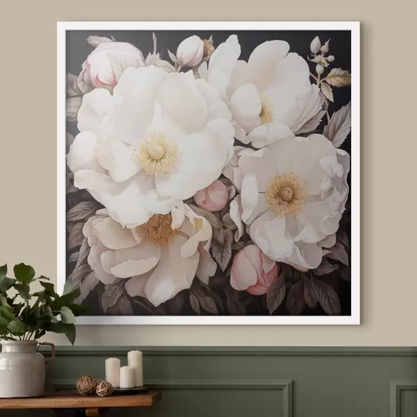 Poster Fiori di peonia bianchi su sfondo scuro in stile pittura acrilica f43379