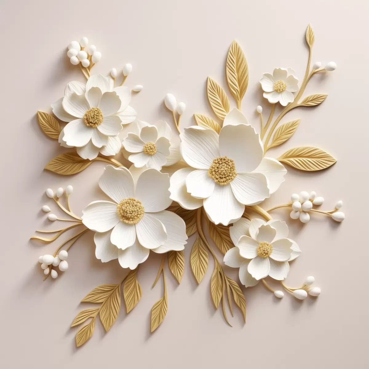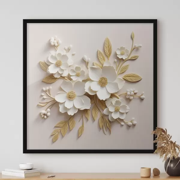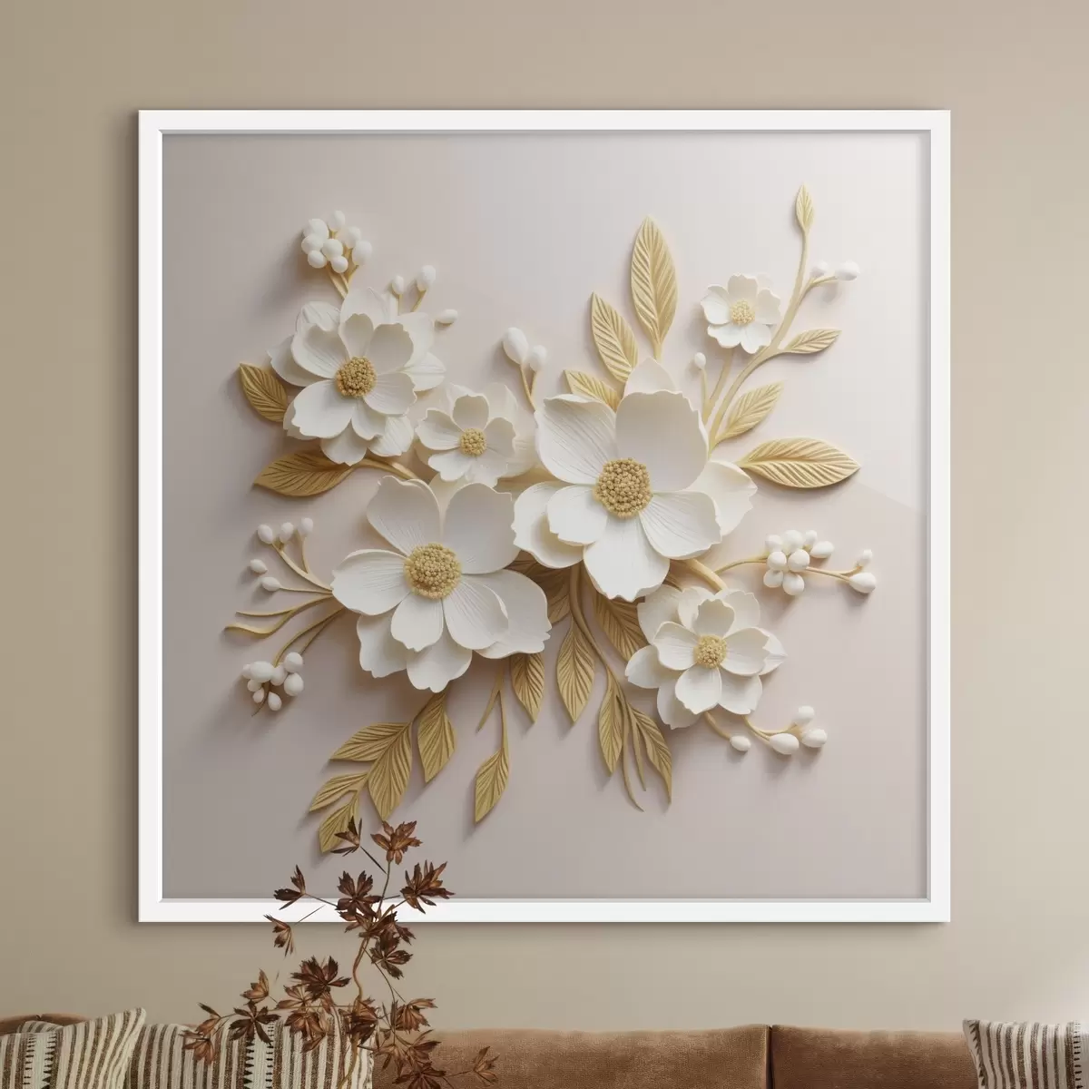 Poster fiori bianchi 3D con foglie su sfondo crema Nr f43383