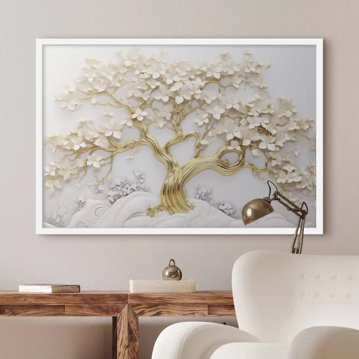 Poster Albero decorativo con fiori bianchi, sfondo bianco, rocce bianche, dettagli intricati, arte ispirata alla natura f43388