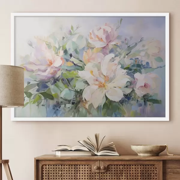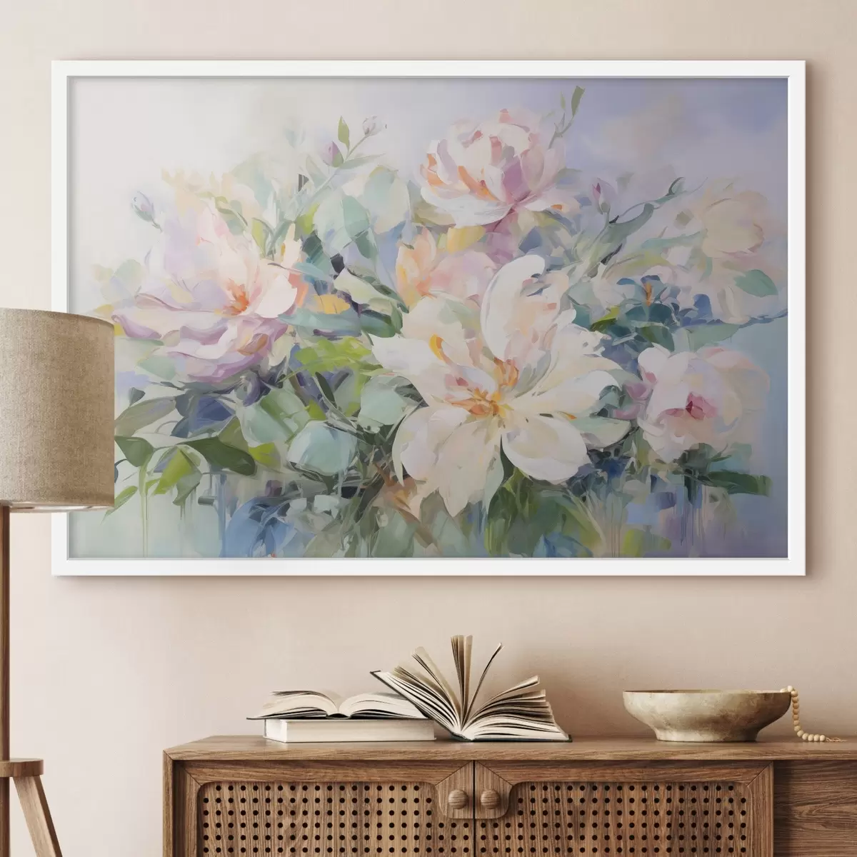 Poster Composizione floreale con fiori color pastello e foglie blu, imitazione di pittura ad olio Nr f43390