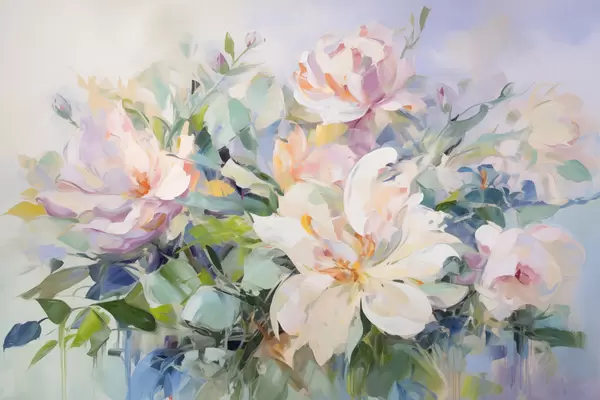 Poster Composizione floreale con fiori color pastello e foglie blu, imitazione di pittura ad olio Nr f43390