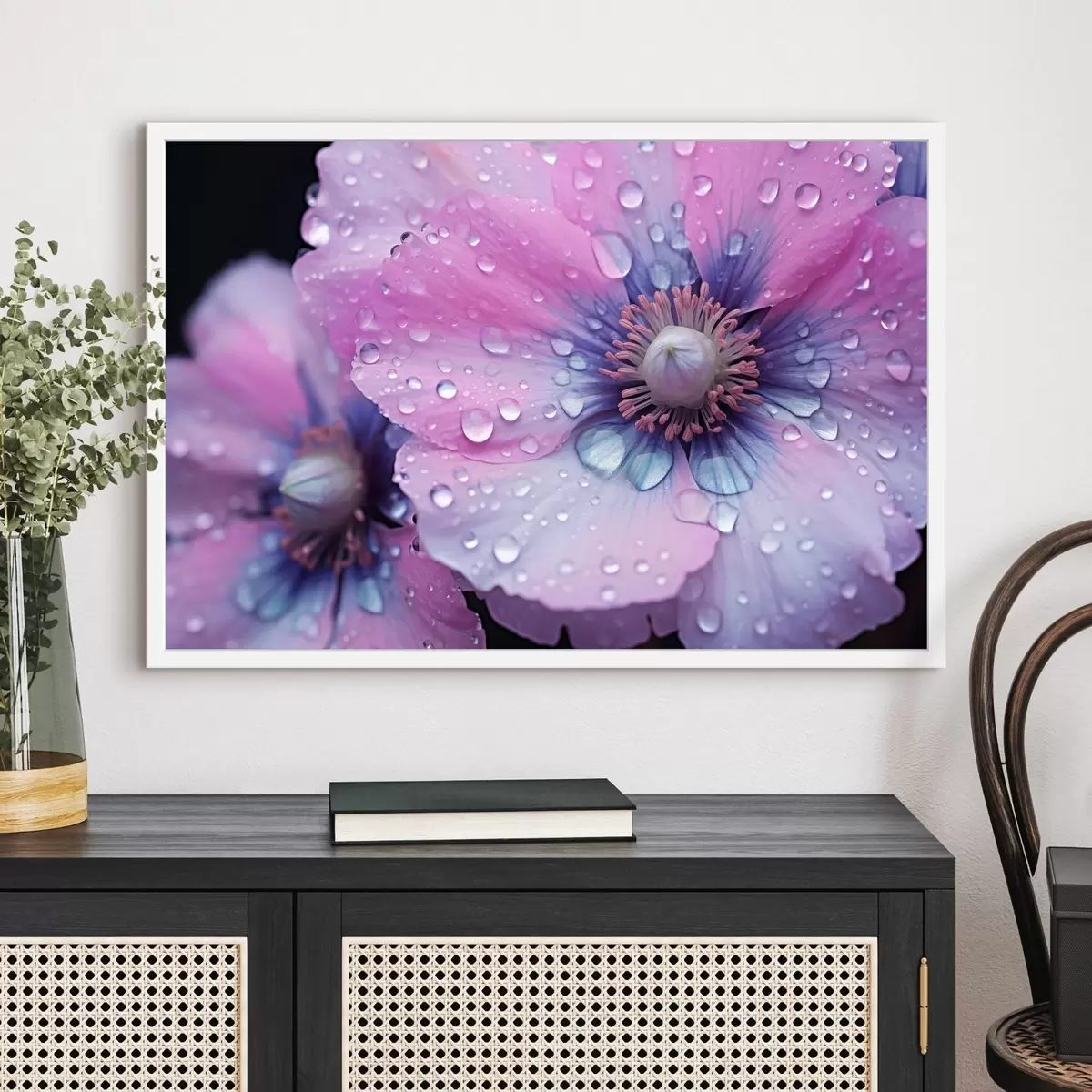 Poster Fiori rosa e viola in piena fioritura ricoperti di gocce d'acqua, su sfondo scuro Nr f43394