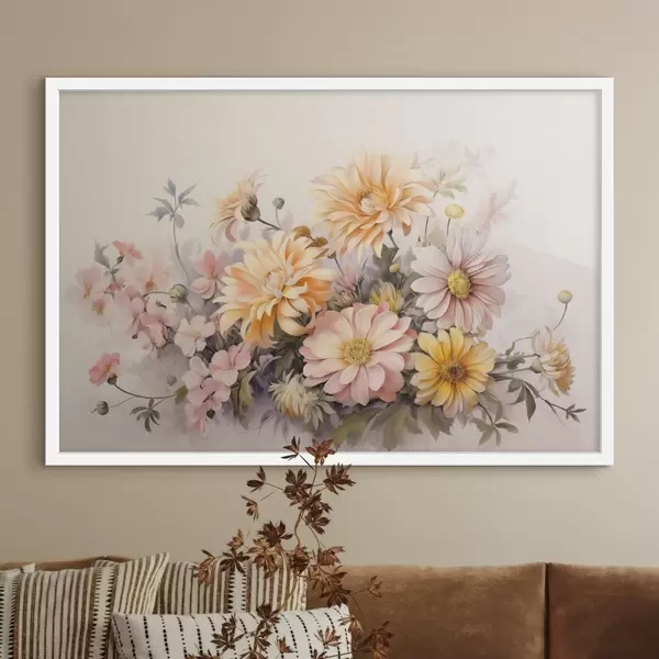 Poster Una collezione di fiori rosa, gialli e arancioni, sfondo chiaro, colori tenui, stile vintage, illustrazione botanica Nr f43401