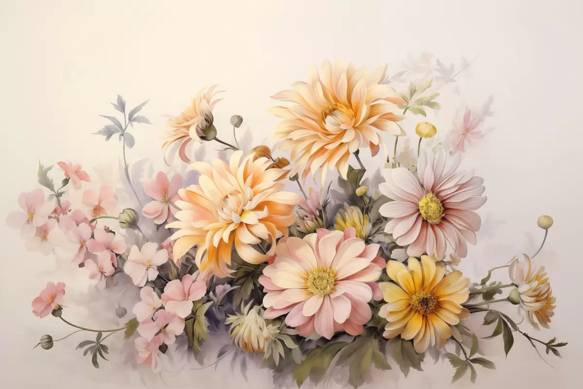 Poster Una collezione di fiori rosa, gialli e arancioni, sfondo chiaro, colori tenui, stile vintage, illustrazione botanica f43401