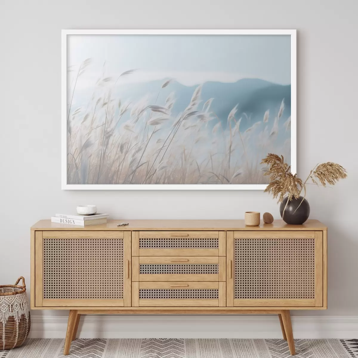 Poster Erba, campo di pampa con una montagna blu sullo sfondo, cielo azzurro, minimalista, colori pastello f43404