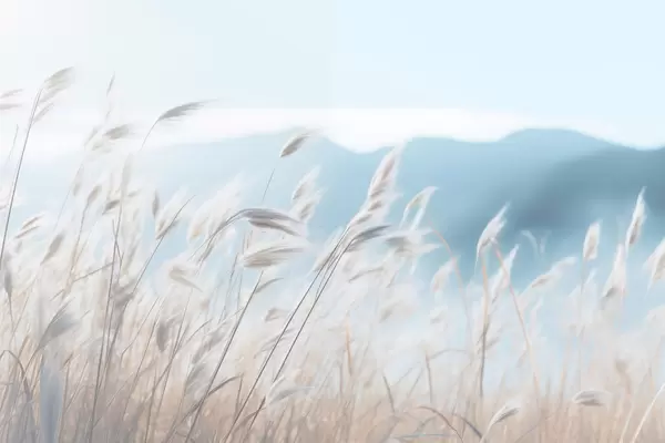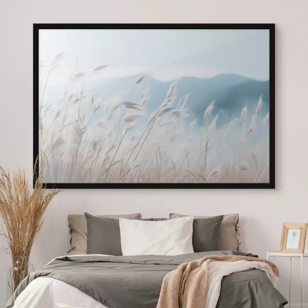 Poster Erba, campo di pampa con una montagna blu sullo sfondo, cielo azzurro, minimalista, colori pastello Nr f43404