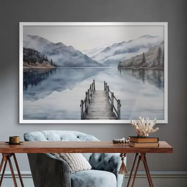 Poster Un pontile di legno si protende in un lago tranquillo, circondato da montagne e alberi sempreverdi, stile acquerello Nr f43405