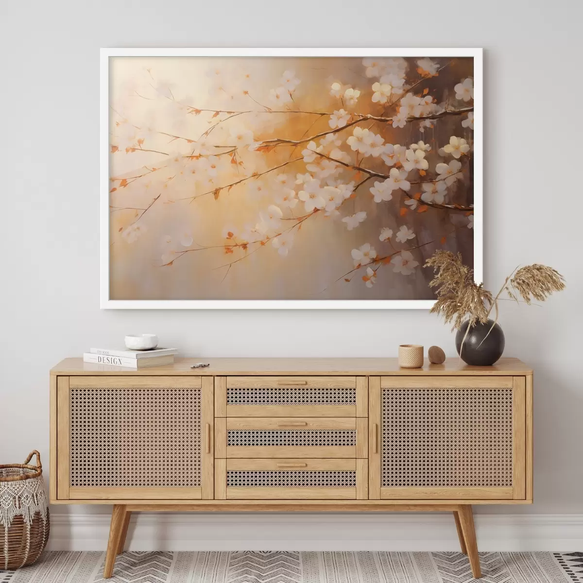 Poster Rami di ciliegio in fiore con fiori arancioni, tavolozza di colori caldi, su uno sfondo sfocato di tonalità gialle Nr f43407