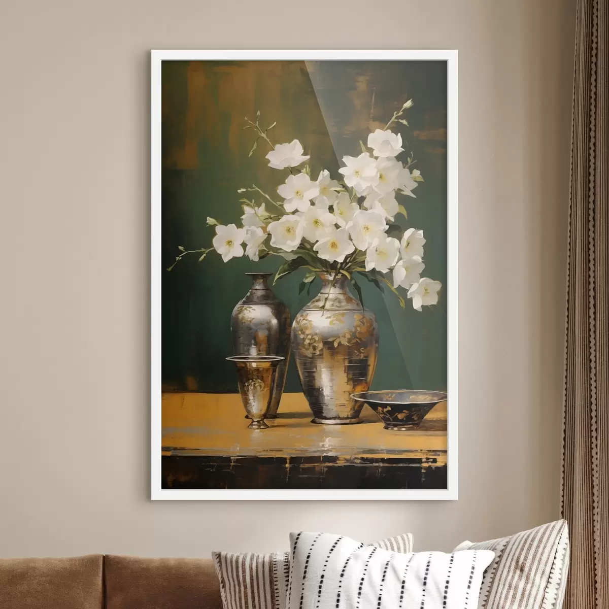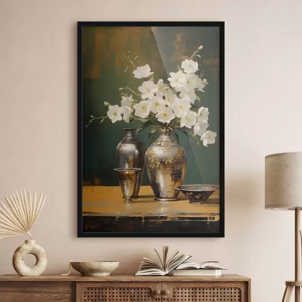 Poster Natura morta di fiori bianchi in vaso, con vasi decorativi e una ciotola su un tavolo verde, sfondo verde scuro Nr f43408