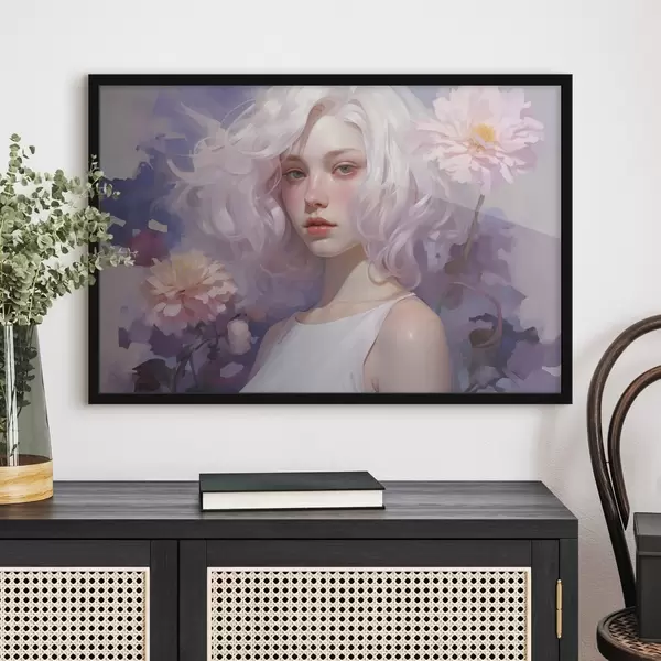 Poster Bella ragazza tra i fiori, disegno in stile acrilico, Giappone, colori viola Nr f43495
