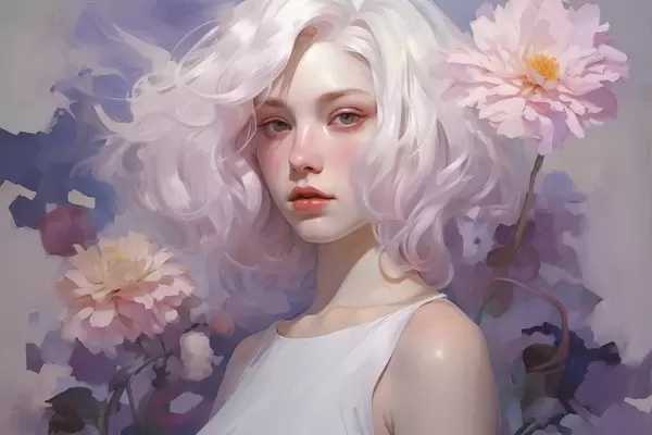 Poster Bella ragazza tra i fiori, disegno in stile acrilico, Giappone, colori viola Nr f43495