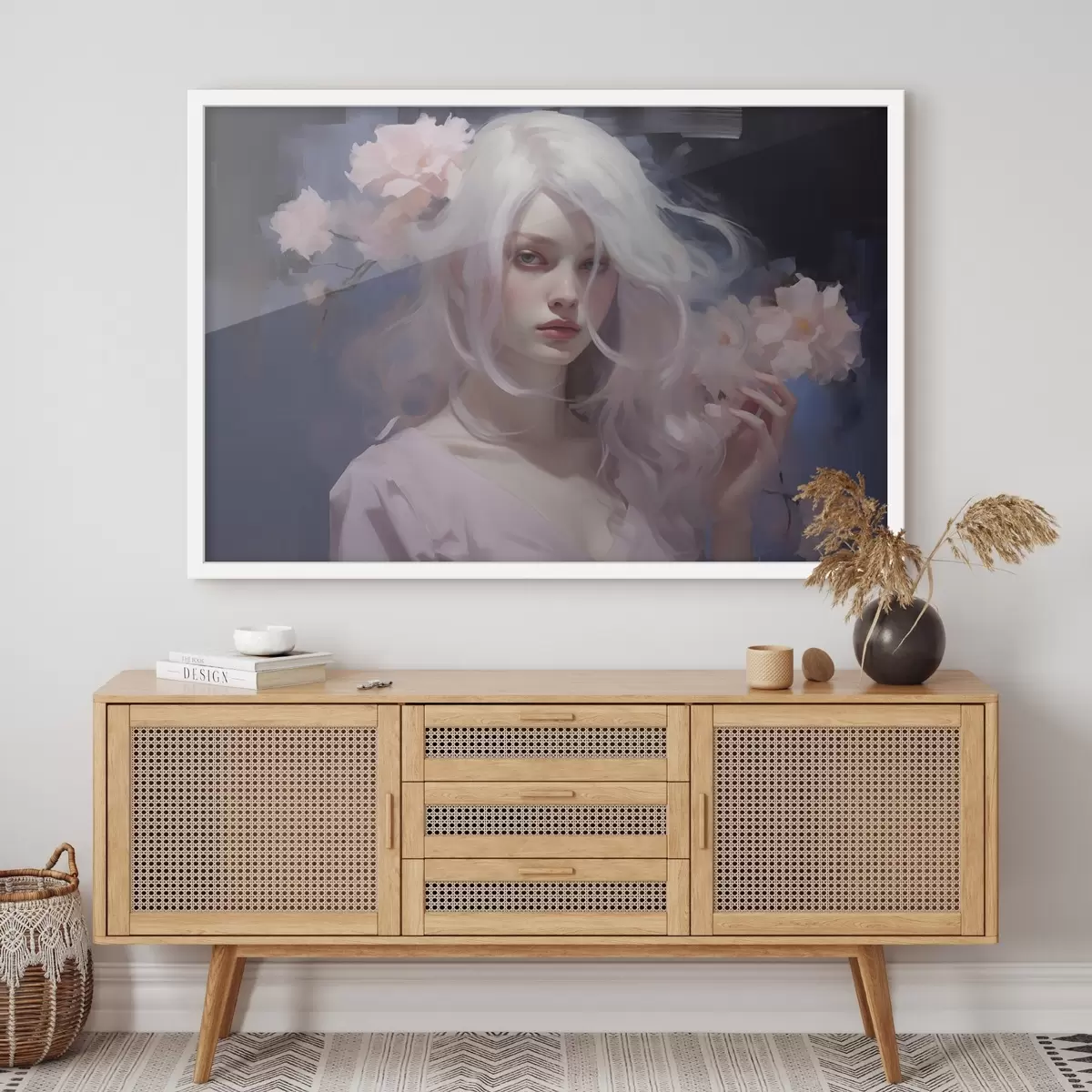 Poster Ragazza con peonie, disegno in stile acrilico, sfondo scuro Nr f43496