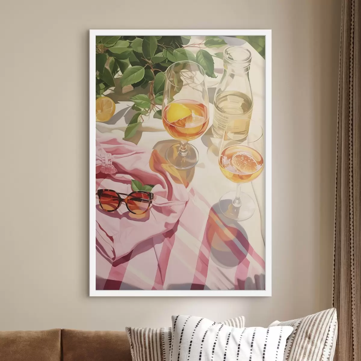 Poster Estate, bicchieri con champagne, piante verdi, colori caldi Nr f43885