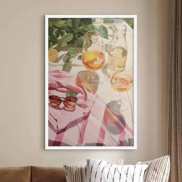 Poster Estate, bicchieri con champagne, piante verdi, colori caldi f43885