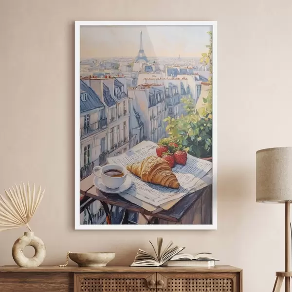 Poster Alba sul balcone di Parigi, torre Eiffel, fragole, caffè, diario f43890