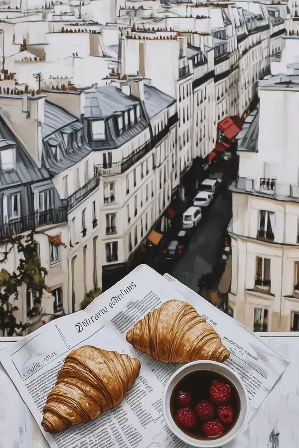 Poster Caffè mattutino con croissant, strada della città, stile architettonico, olio Nr f43891