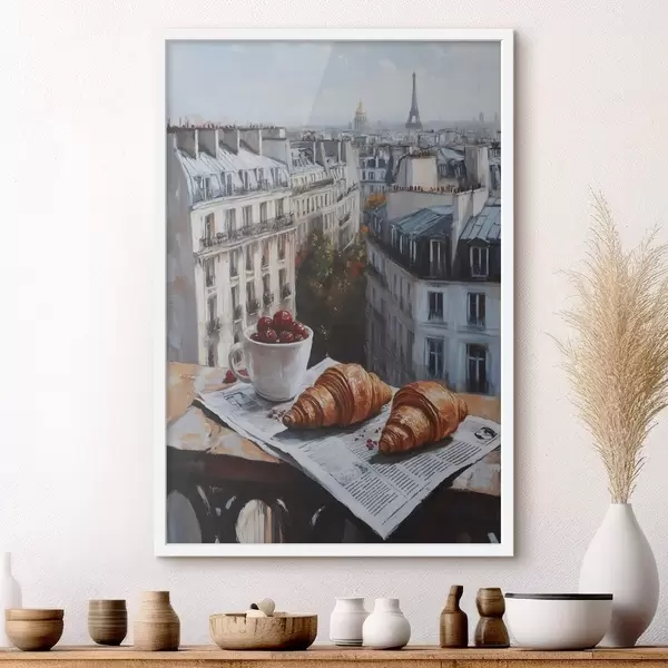Poster Mattina a Parigi, caffè con croissant, vista della città, disegno ad olio Nr f43892