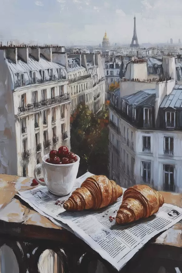 Poster Mattina a Parigi, caffè con croissant, vista della città, disegno ad olio Nr f43892