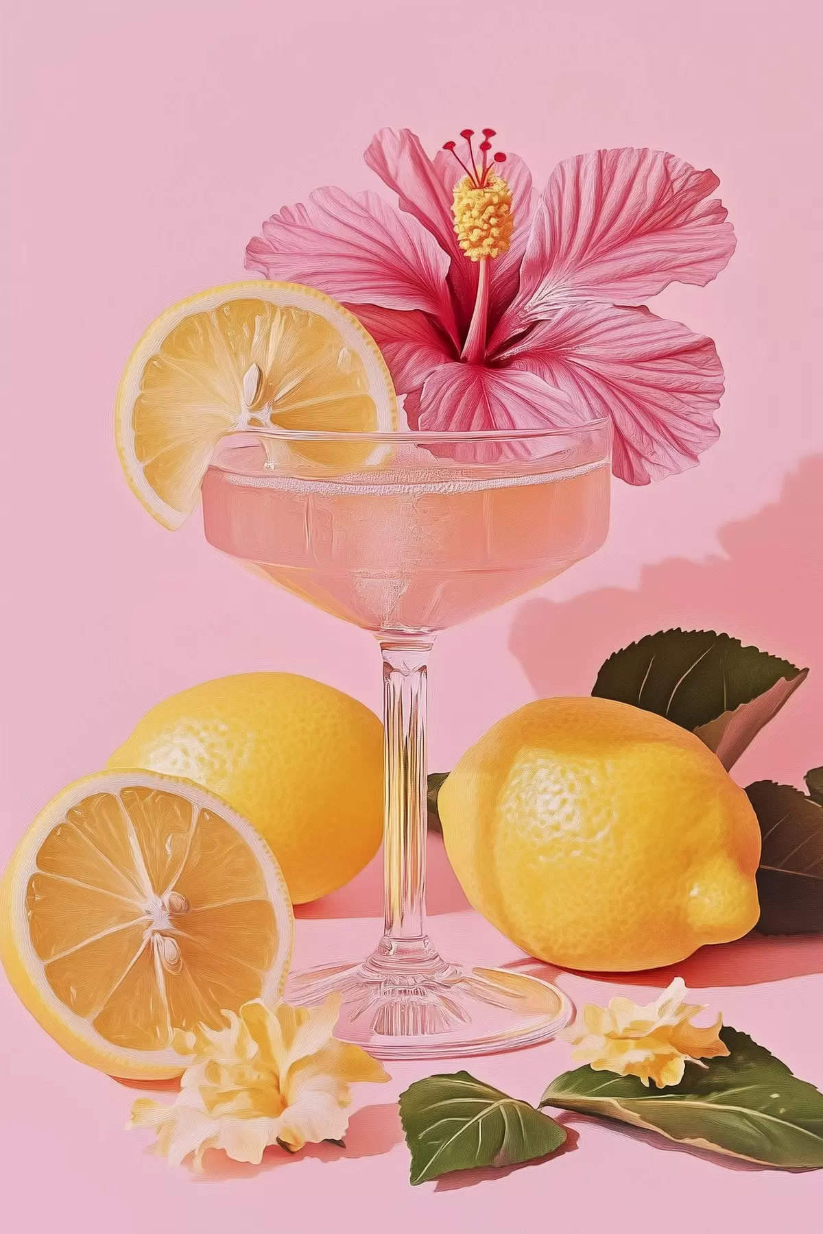 Poster Cocktail rosa con fiori di ibisco, limoni, realismo f43893