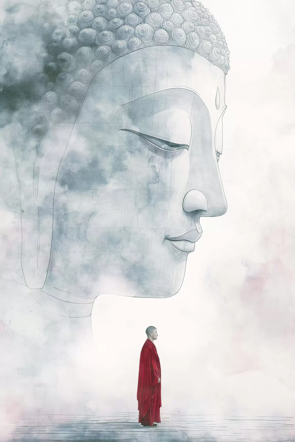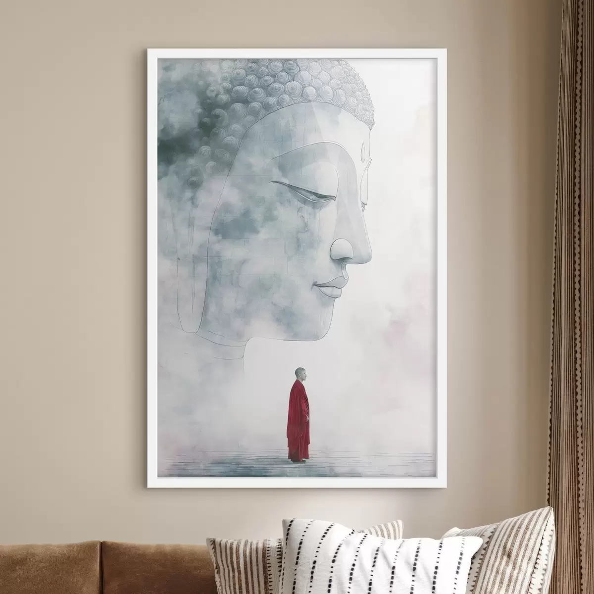 Poster Monaco buddista in tunica rossa, sagoma di Buddha, stile acquerello Nr f44006